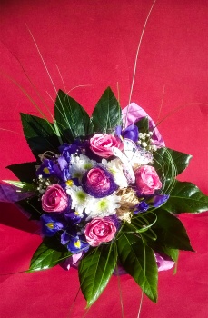 Kytice růžových růží ozdobených fialkovým kokosovým vláknem společně s fialovými Irisy působí mladistvě a svěže.