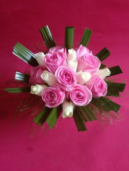 Kulatá nízká kytička z růží v bílo  růžové kombinaci.